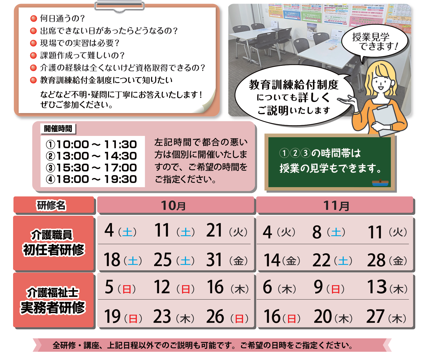 各日程、オンライン(Zoom)での説明会も可能です!(体験受講はありません)