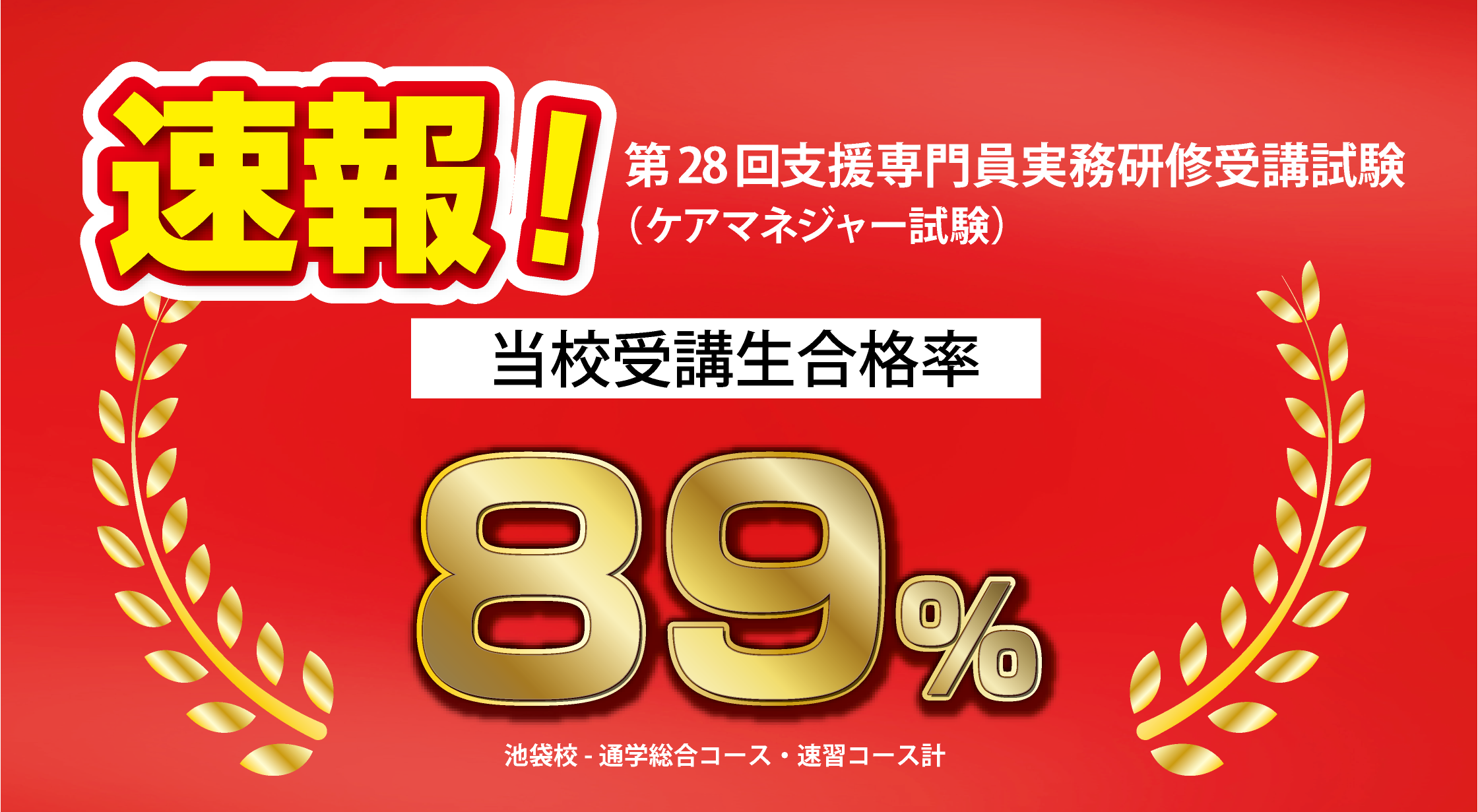 当校にて開催した「ケアマネジャー受験対策講座」を受講いただいた方の合格率が、89%となりましたのでお知らせします。