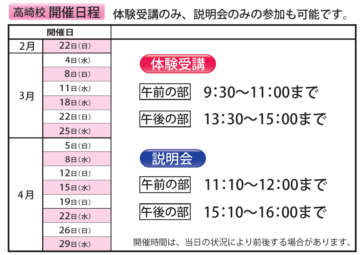 3~4月の開催日程は、以下の通りです。