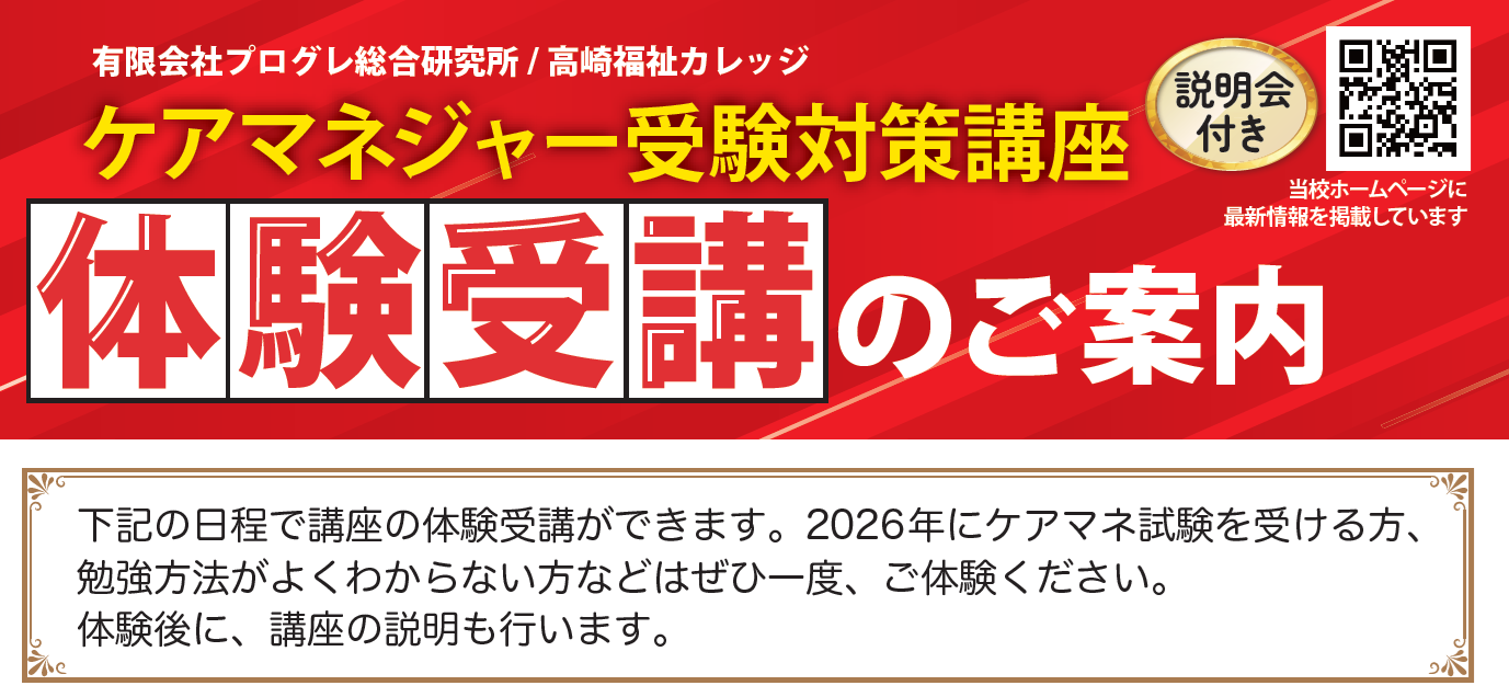 ケアマネジャー受験対策講座の受講をご検討されている皆様、高崎校では、ケアマネジャー受験対策講座の一部を体験受講することができます。